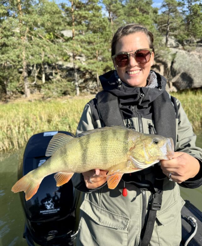 Ovan är Malin med en riktigt präktig abborre från en septemberguidning. Läs gärna mer om guidningar på sidan Aktuella fiskerapporter och priser på sidan Kontakt och priser. Vill du följa med ut själv kan du boka en egen plats i båten; läs mer om öppna ”drop-in” guidningar på sidan Öppen guidning/Drop-in och allt om presentkort hittar du på presentkort! Du kan givetvis även boka båten som eget sällskap och välja datum friare. Jag guidar främst på torsdagar, fredagar och lördagar. Välkommen!