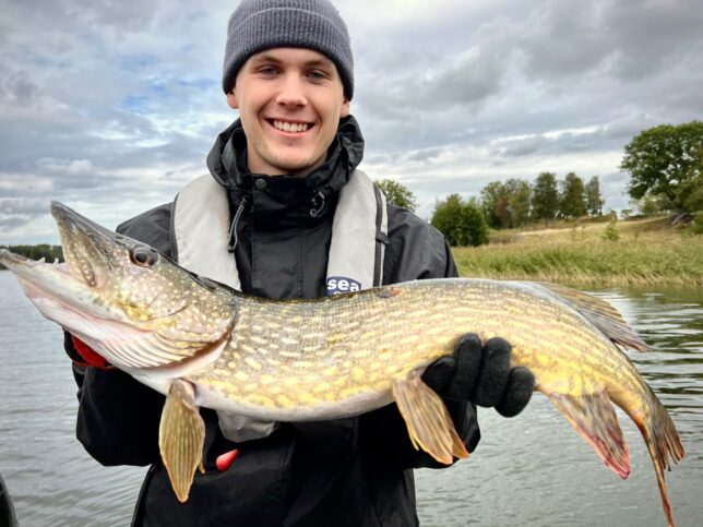 Ingen i familjen hade fått en gädda tidigare och endast Alexander hade spinnfiskat förut så vi gick igenom en del kast- och vevteknik till en början. Efter ett tag så satt allt som det skulle och nappen förvandlades till fisk som följde med ända upp i båten!